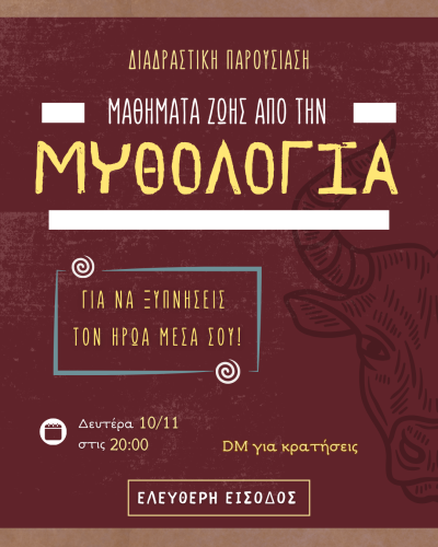Σε αυτήν την παρουσίαση -μυθική εμπειρία- θα καταδυθούμε στον μύθο, στα σύμβολά του και τις δυνάμεις του, στους θεούς & τους δαίμονες και θα ανασύρουμε ό,τι πολύτιμο ανακαλύψουμε και μπορεί να μας προσφέρει: